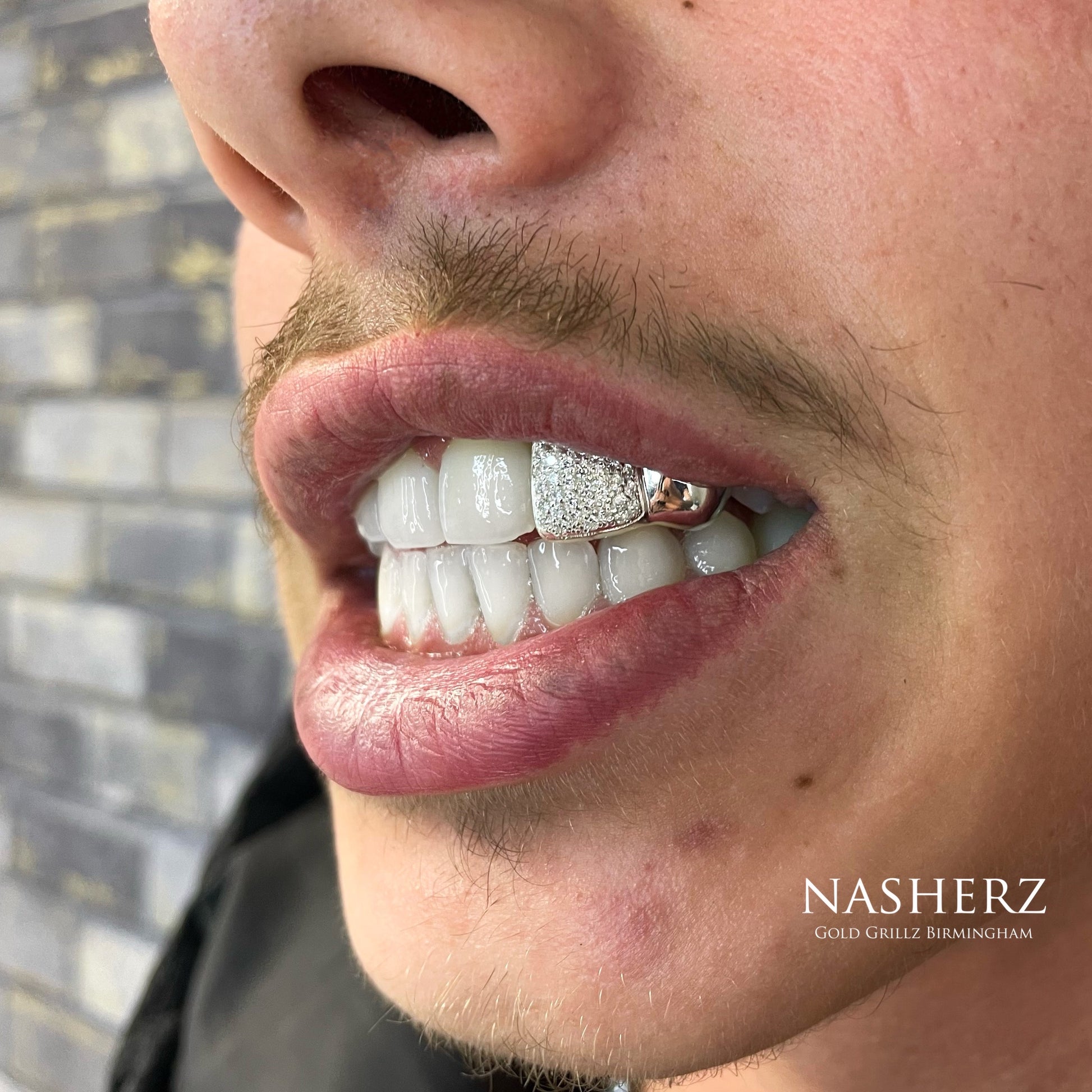 Diamond pave-set grillz using a 20X microscope to pack the diamonds in tight with minimal metal on show, achieving a fully flooded aesthetic.